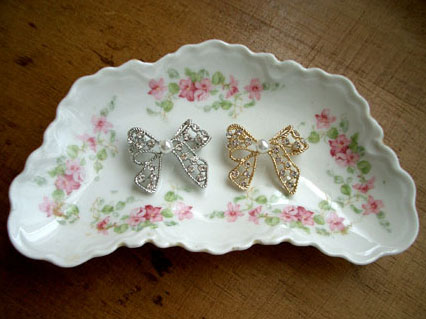 大好きなリボンの形で、真ん中の大きめのパールと周りのミニダイアの組み合わせが、控えめな華やかさです。